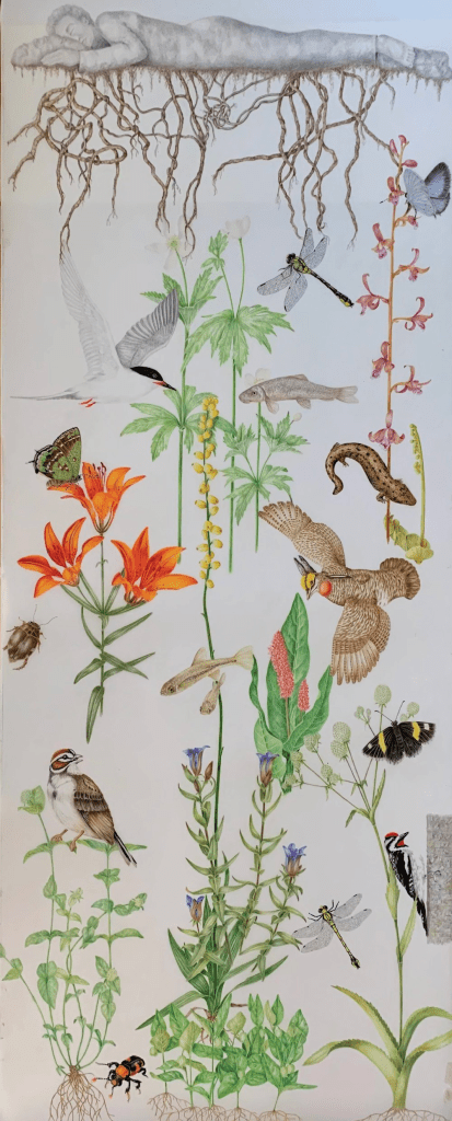 Wake Up This eponymous piece, with the supine figure of a human at the top, measures 17” x 42.” The drawing includes plants, birds, dragonflies, salamanders, fish, butterflies, and beetles with evocative names like Curly-heads, Rattlesnake-master, Lark Sparrow, Roseate Tern, Skillet Clubtail Dragonfly, Common Mudpuppy, Dusky Azure, and Schwarz Diving Beetle. (What’s not to love?)
