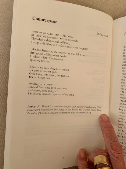 My poem, “Counterpane” has been included in a new anthology of poems for and about LGBTQ and Trans people. I wrote the poem for my beloved daughter, Zoey.